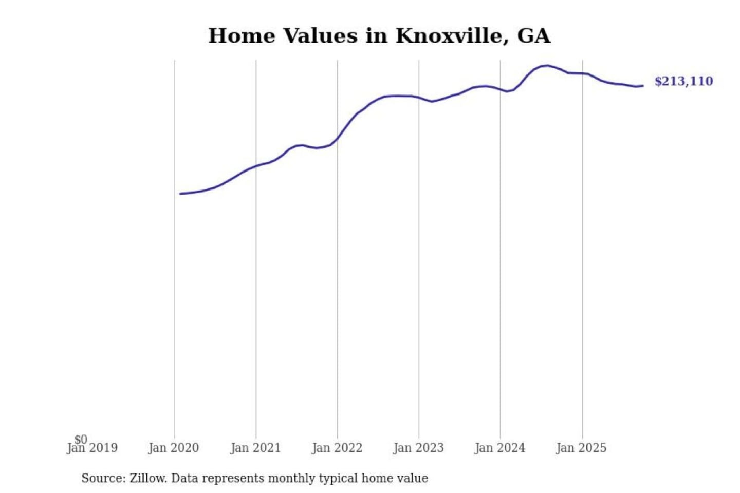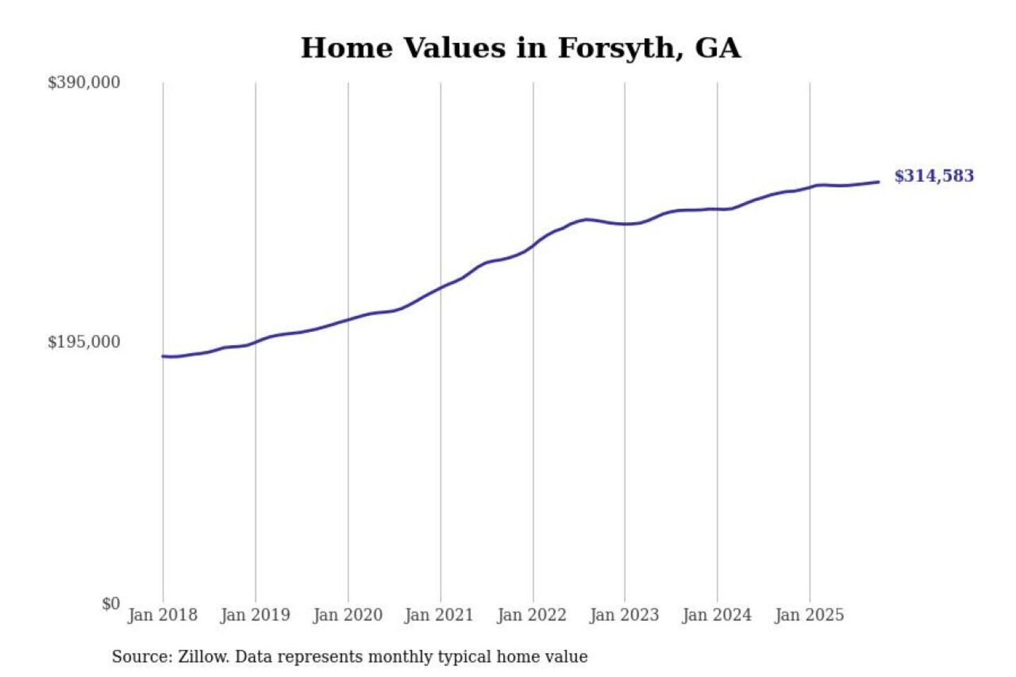 Stacker compiled a list of cities with the most expensive homes in the Macon-Bibb County, GA metro area using data from Zillow. Charts show the monthly typical home value since January 2018.
