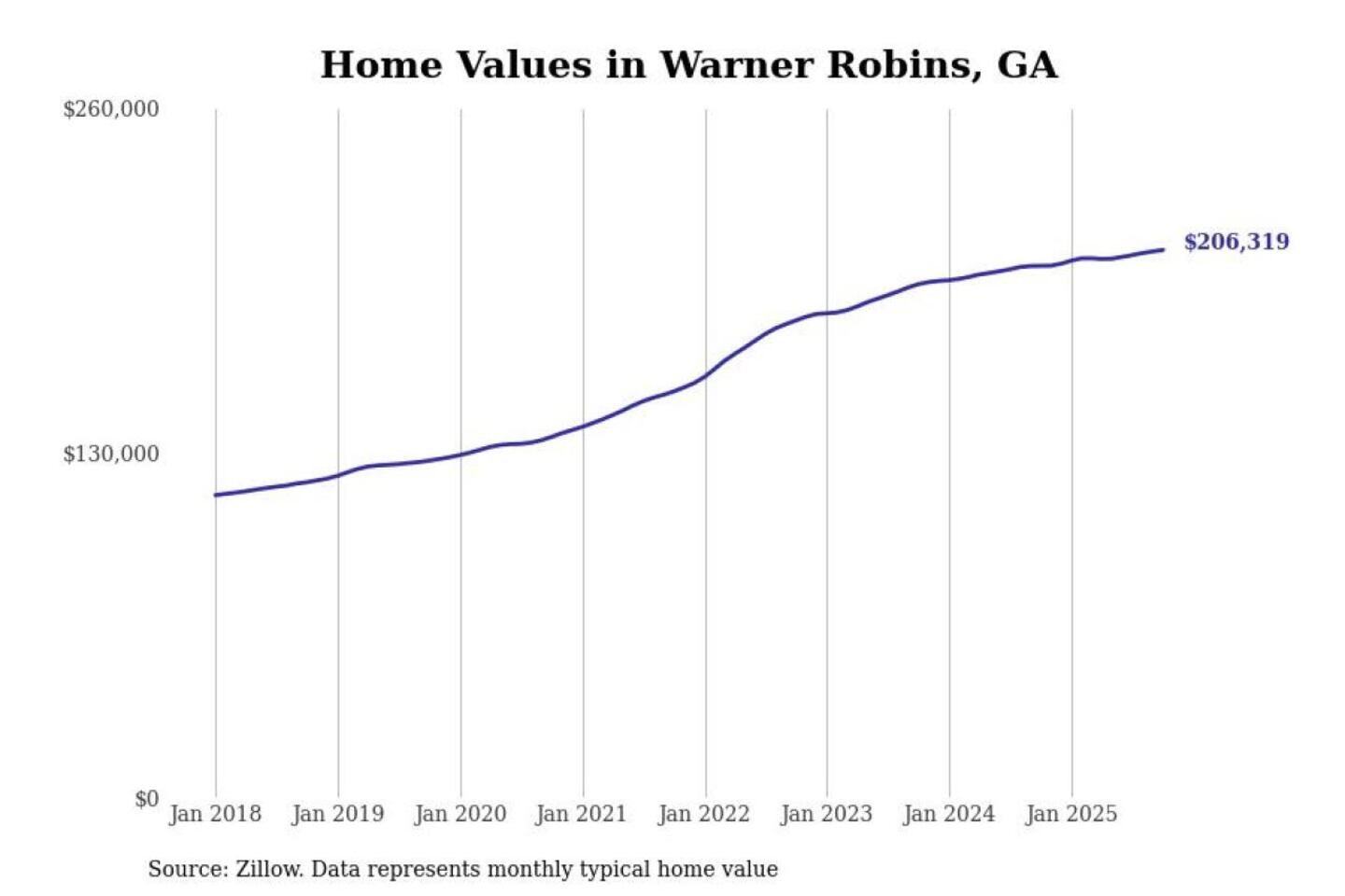 Stacker compiled a list of cities with the most expensive homes in the Warner Robins metro area using data from Zillow. Charts show the monthly typical home value since January 2018. All 9 cities and towns with data available were included in the list.