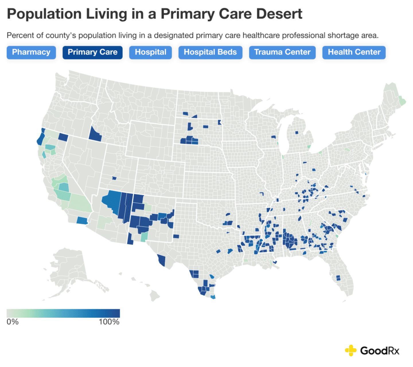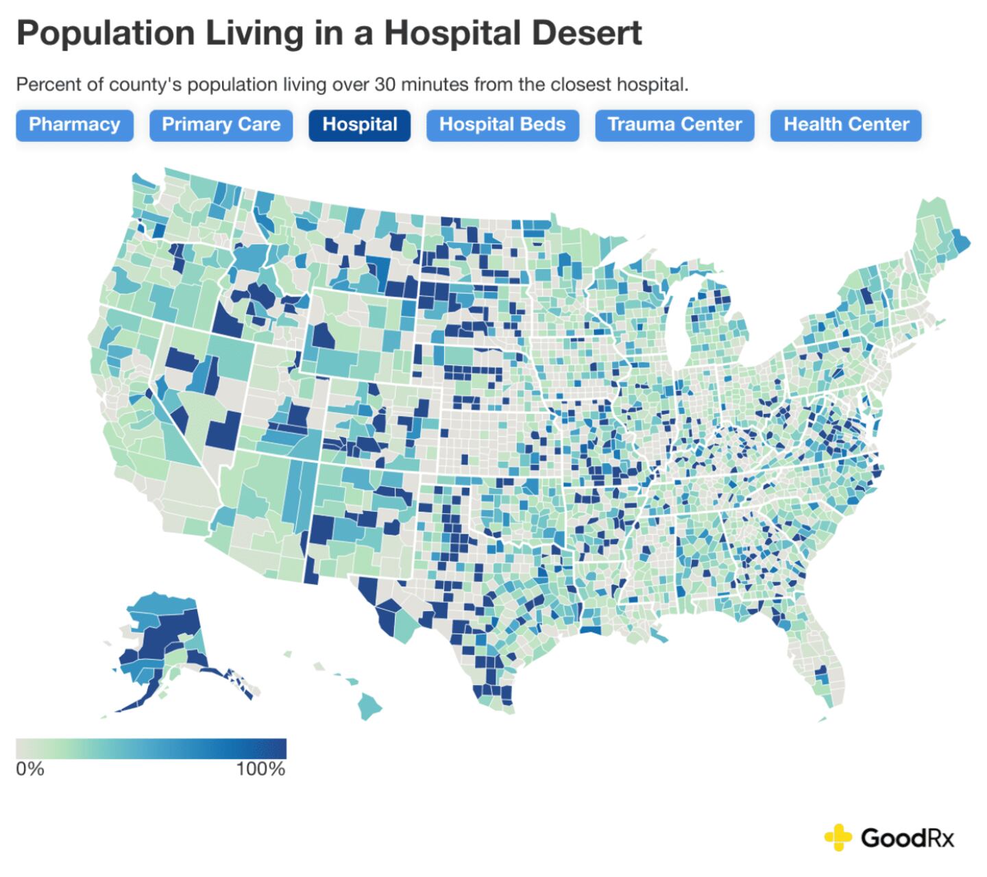 Today, roughly 81% of counties across the U.S. are healthcare deserts of some kind, meaning the majority of the population lacks proper access to pharmacies, primary care, hospitals, hospital beds, trauma centers, or community health centers. GoodRx estimates show that over 120 million people currently live in a healthcare-desert county, accounting for roughly a third of the U.S. population.