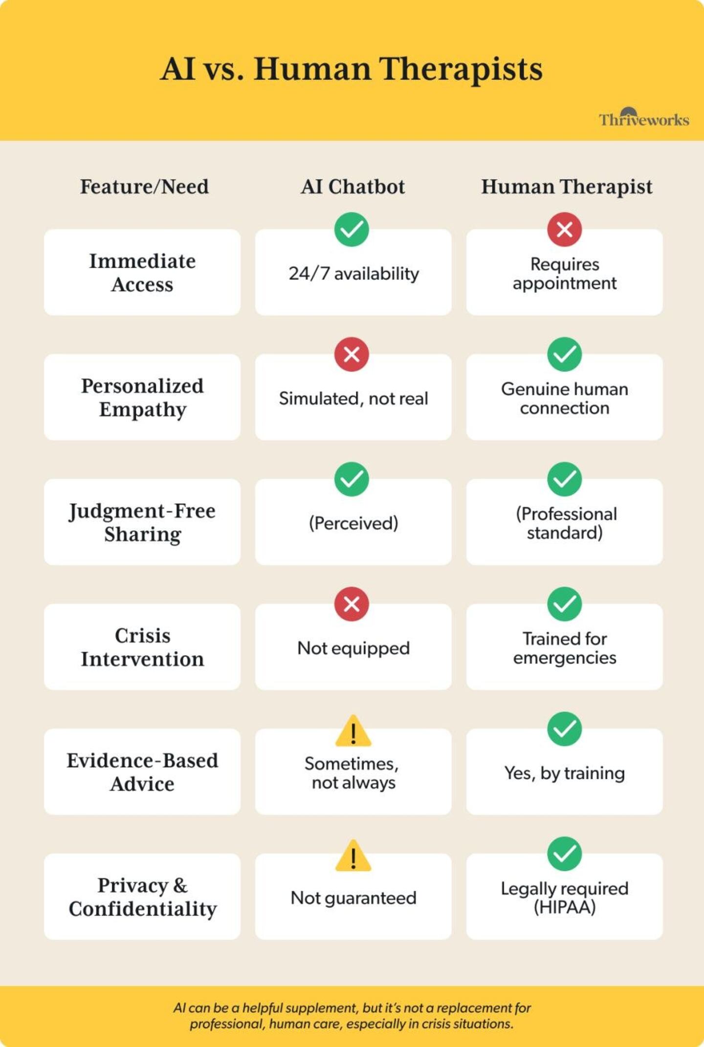 Despite these advances, real-life therapists remain essential. "Human care will always be huge and necessary for a pretty large segment of the population," Jacobson says. AI, even when trained by humans, can't replace real empathy, Werntz adds. "AI can never replace another person truly caring for us."