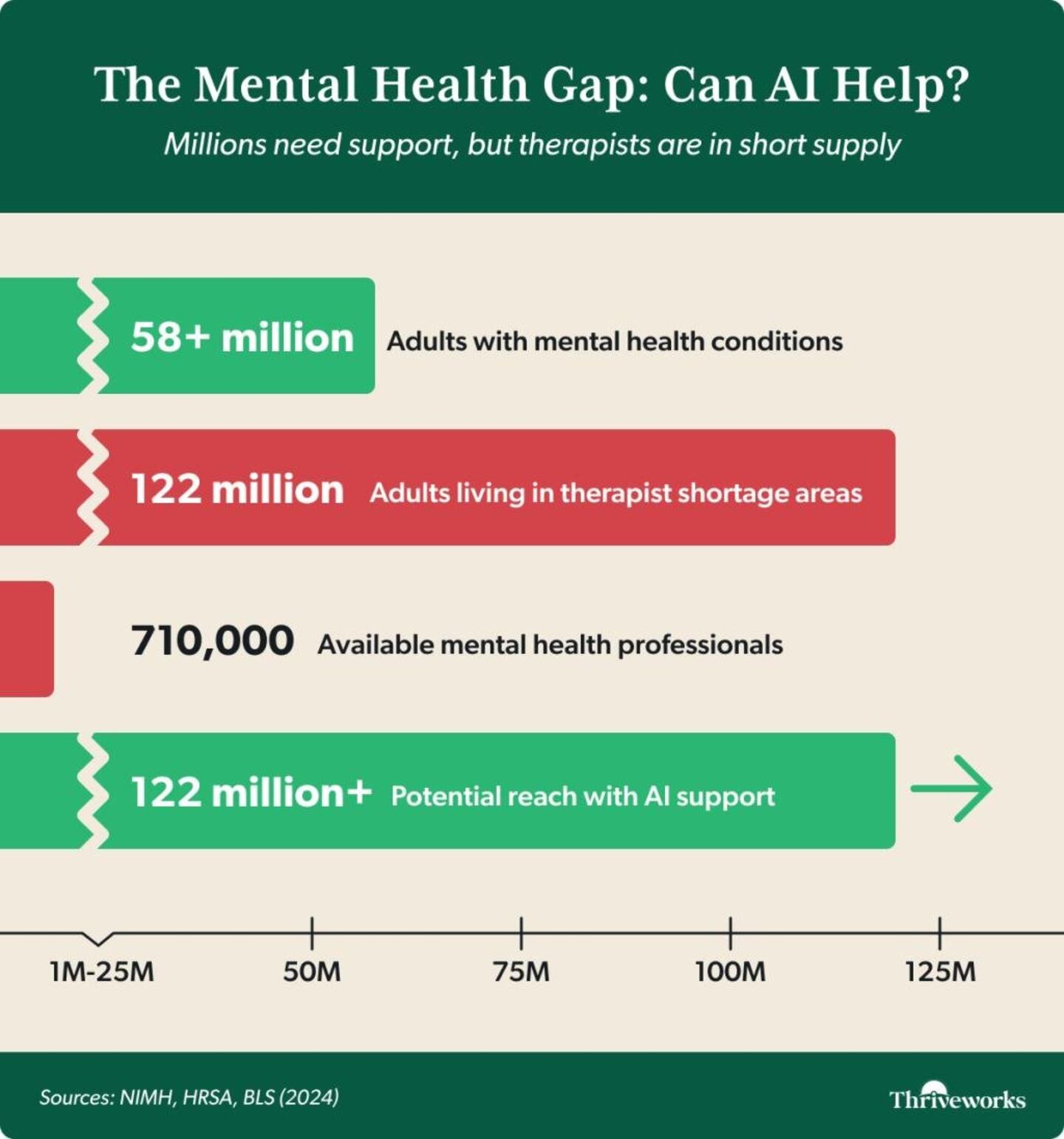 "The need for innovative solutions is urgent," researchers noted in a 2024 paper on AI and mental health. AI's key advantage? Immediate access.