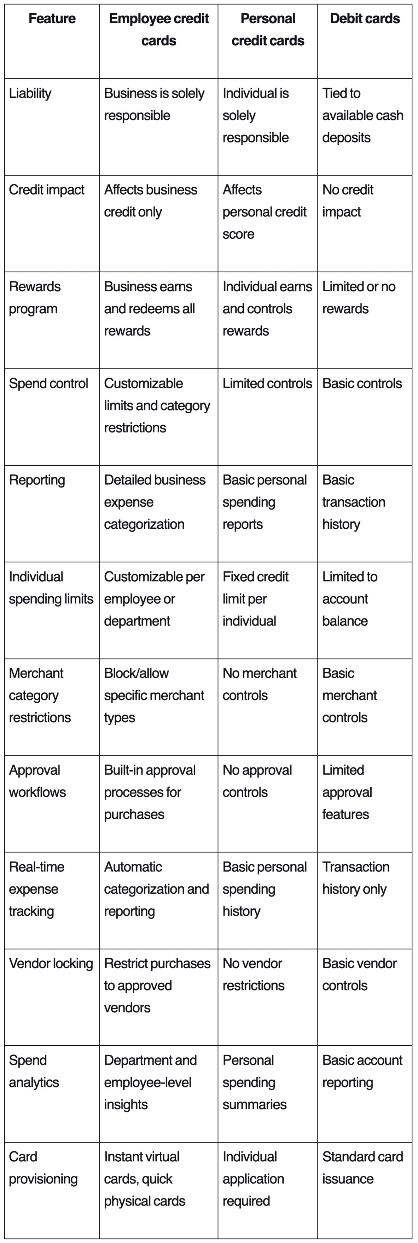 Key differences that make employee credit cards valuable for small and mid-sized businesses include: