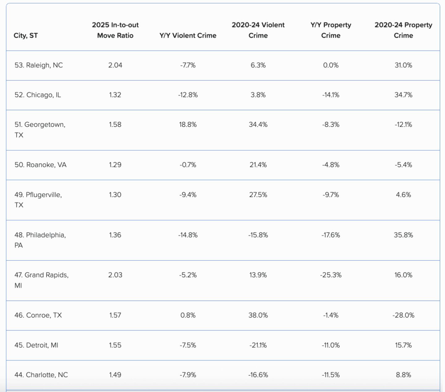 • 73% of 2025's most searched relocation cities are safer due to falling crime rates, both top move-to destination and exit cities.