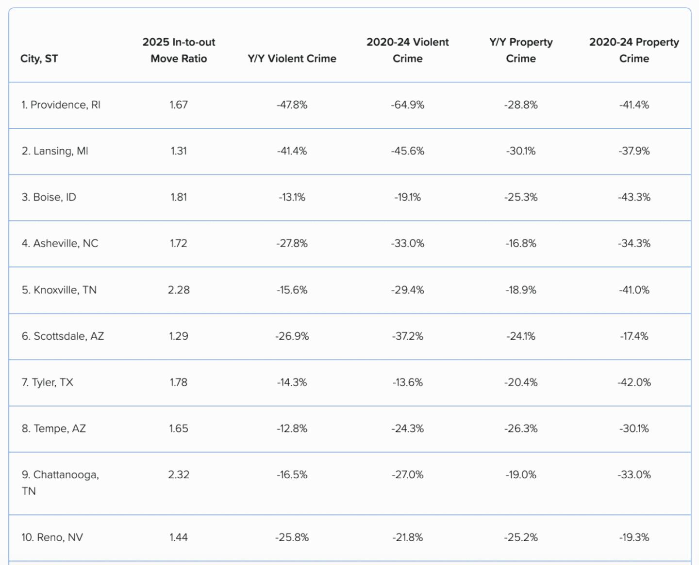 • Movers are flocking to Providence, Rhode Island, Lansing, Michigan, and Boise, Idaho, and crime is dropping at the highest rates.