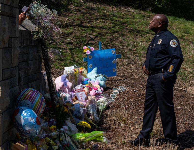 The Covenant School NASHVILLE, TN - MARCH 28: Chief of Police John Drake looks at memorial items left at the entrance of The Covenant School on March 28, 2023 in Nashville, Tennessee before a press briefing. According to reports, three students and three adults were killed by the 28-year-old shooter on Monday. (Photo by Seth Herald/Getty Images) (SETH HERALD/Getty Images)