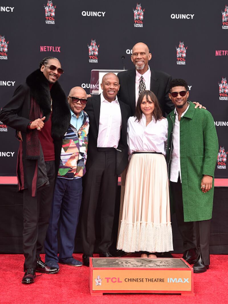 Photos: Dr. Dre through the years 2018: Snoop Dogg, Quincy Jones, Dr. Dre, Rashida Jones, Kareem Abdul-Jabbar and Usher attend Quincy Jones' Hand and Footprint ceremony at the TCL Chinese Theatre IMAX on November 27, 2018, in Hollywood, California. (Alberto E. Rodriguez/Getty Images)