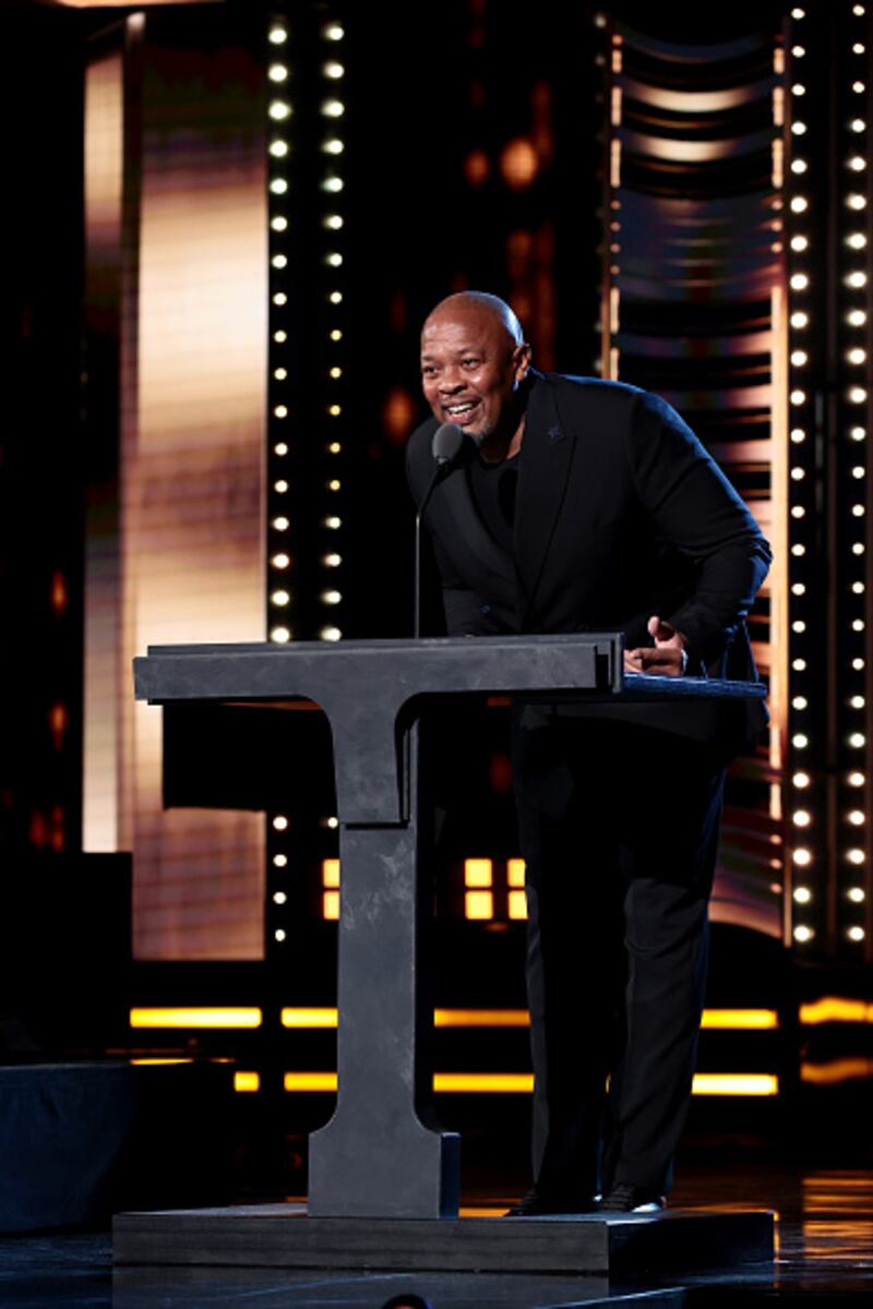 Photos: Dr. Dre through the years 2021: Dr. Dre speaks onstage during the 36th annual Rock & Roll Hall of Fame Induction Ceremony at Rocket Mortgage Fieldhouse on October 30, 2021, in Cleveland, Ohio. (Dimitrios Kambouris/Getty Images for The Rock and Roll Hall of Fame)