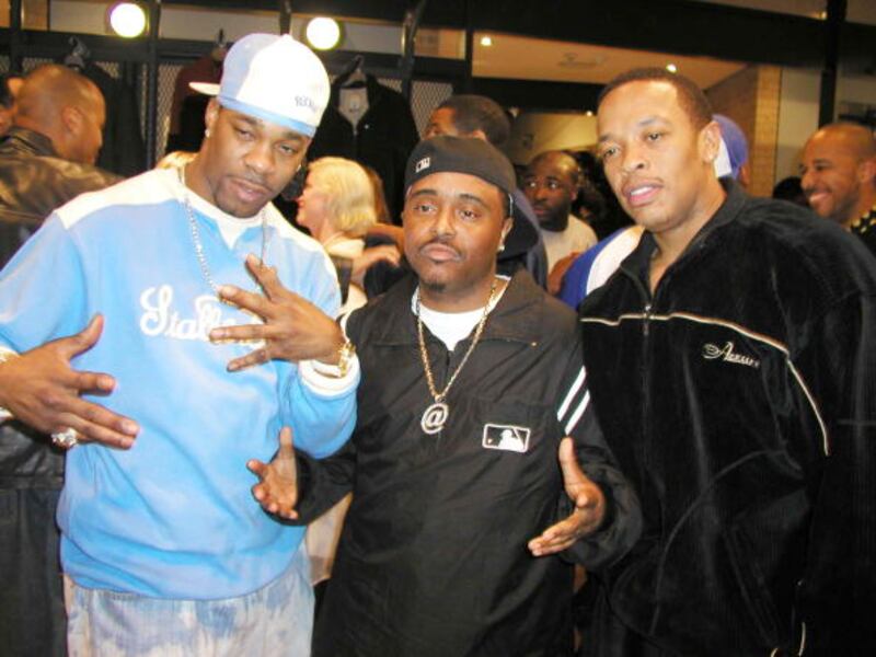 Photos: Dr. Dre through the years 2003: Rapper Busta Rhymes, comedian Alex Thomas and rapper Dr. Dre pose at the Nike and Universal Music present Nelly and St. Lunatics American Music Awards Party Co-sponsored by Remy at the Nike store on January 13, 2003, in Beverly Hills, California. (Getty Images)