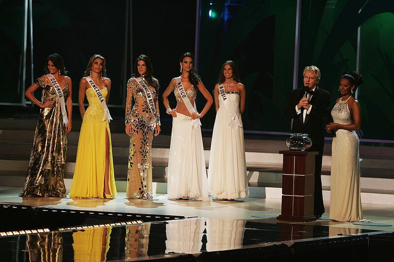 57th Annual Miss Universe 2008 Competition NHA TRANG, VIET NAM - JULY 14: (L-R) Miss Colombia Taliana Vargas, Miss Venezuela Dayana Mendoza crowned Miss Universe 2008, Miss Dominian Republic Marianne Cruz Gonzalez, Miss Mexico Elisa Narjera, Miss Russia Vera Krasova, with Hosts Jerry Springer and Mel B on stage during the 57th Annual Miss Universe Competition at the Crown Convention Centre on July 14, 2008 in Nha Trang, Vietnam. (Photo by Gaye Gerard/Getty Images) (Gaye Gerard/Getty Images)