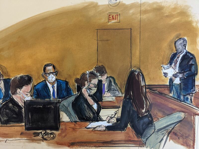 Images: R. Kelly found guilty of racketeering, sex trafficking charges In this courtroom sketch, R. Kelly listens from the middle of defense table (white mask, glasses, blue jacket) while the jury foreperson, far right, reads the verdict, Monday, Sept. 27, 2021, in New York. (AP Photo/Elizabeth Williams)
