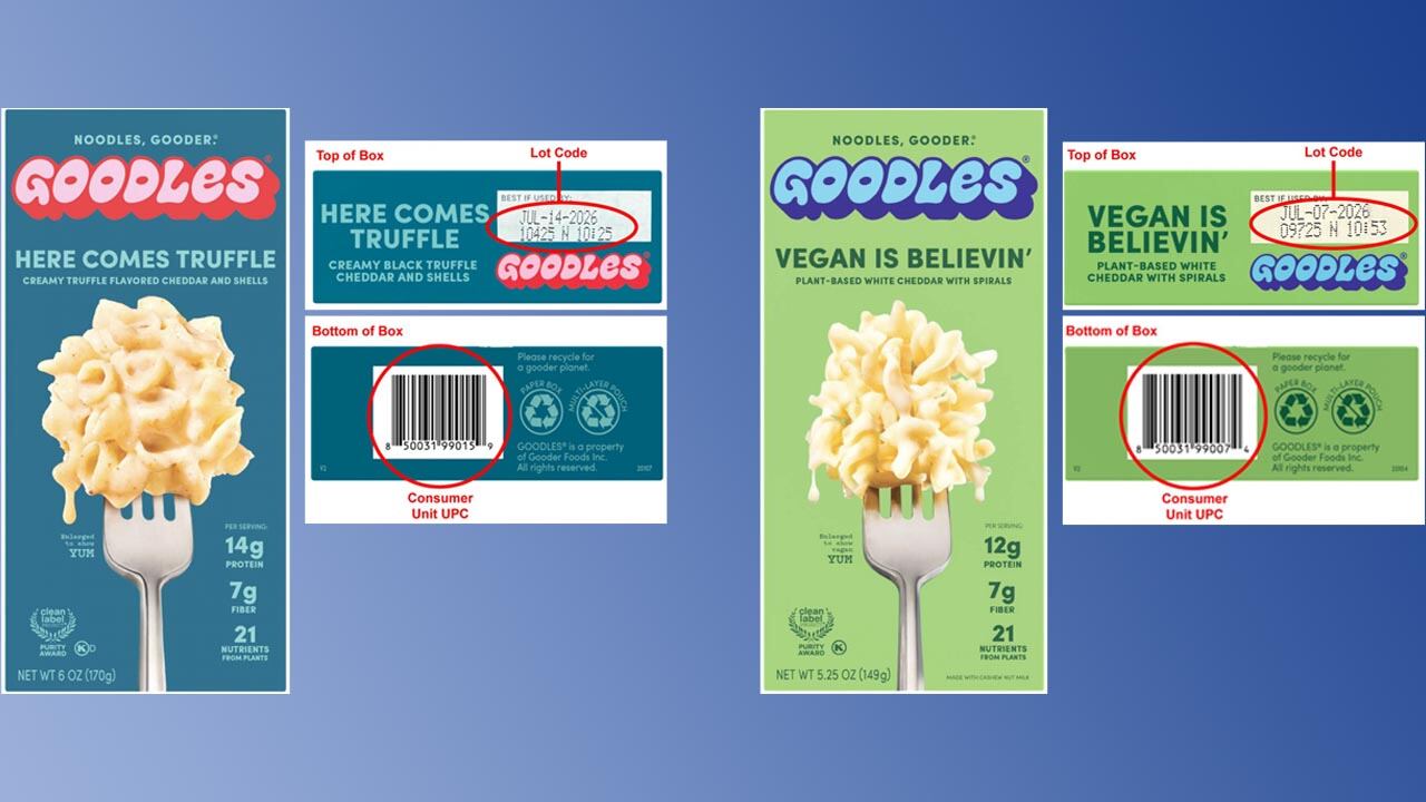 Two products are part of the recall: Goodles Vegan is Believin’ – Plant Based White Cheddar with Spirals (UPC 850031990074) and Goodles Here Comes Truffle –Creamy Truffle Flavored Cheddar and Shells (UPC 850031990159), the FDA said.