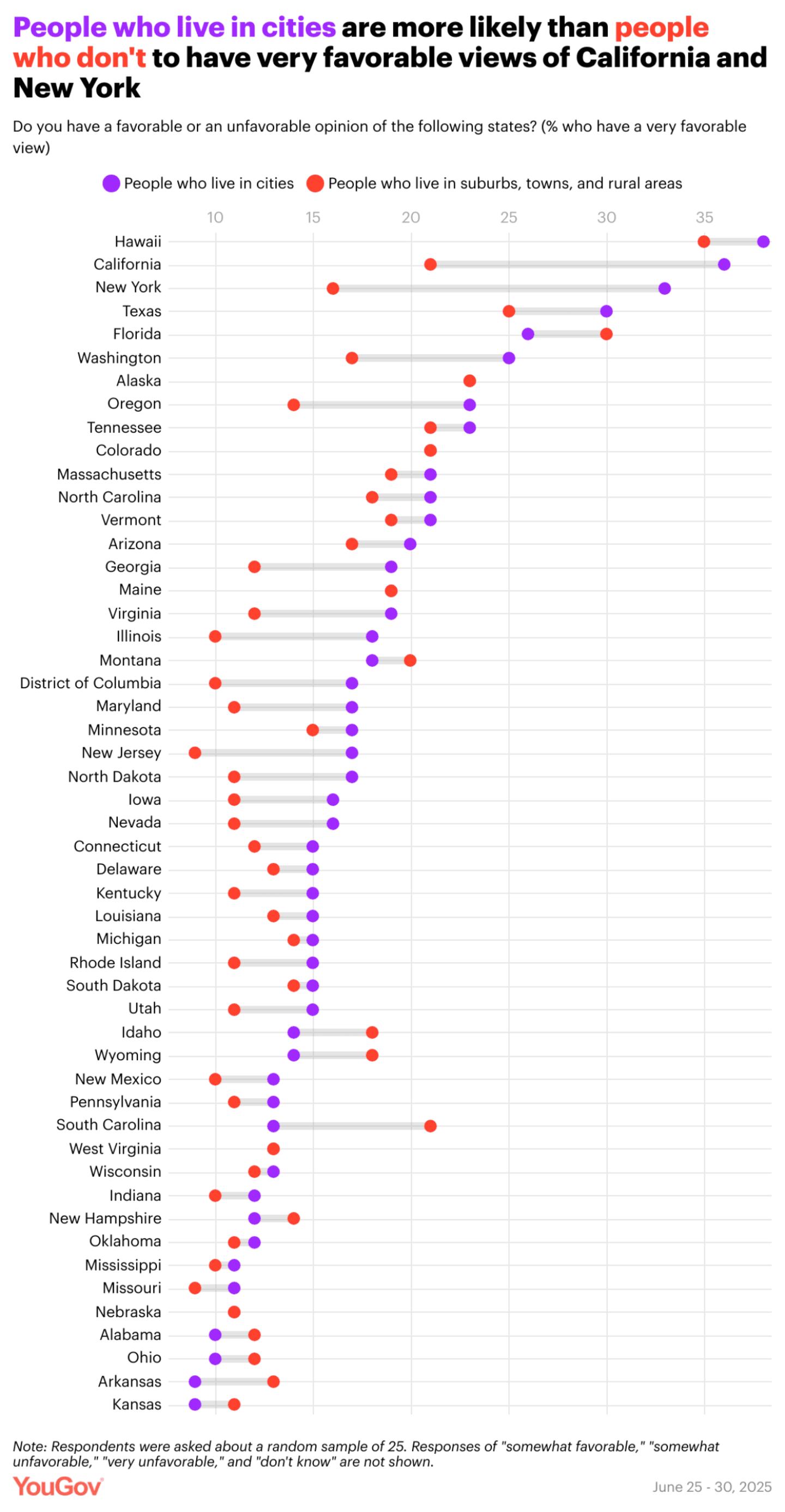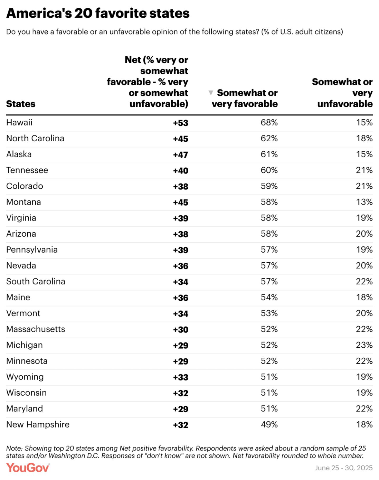Hawaii is America's favorite state in 2025, according to a new YouGov survey that asked 2,000+ Americans which states they view most and least favorably. Meanwhile, fewer Americans have a favorable view of Washington, D.C. than of any state.