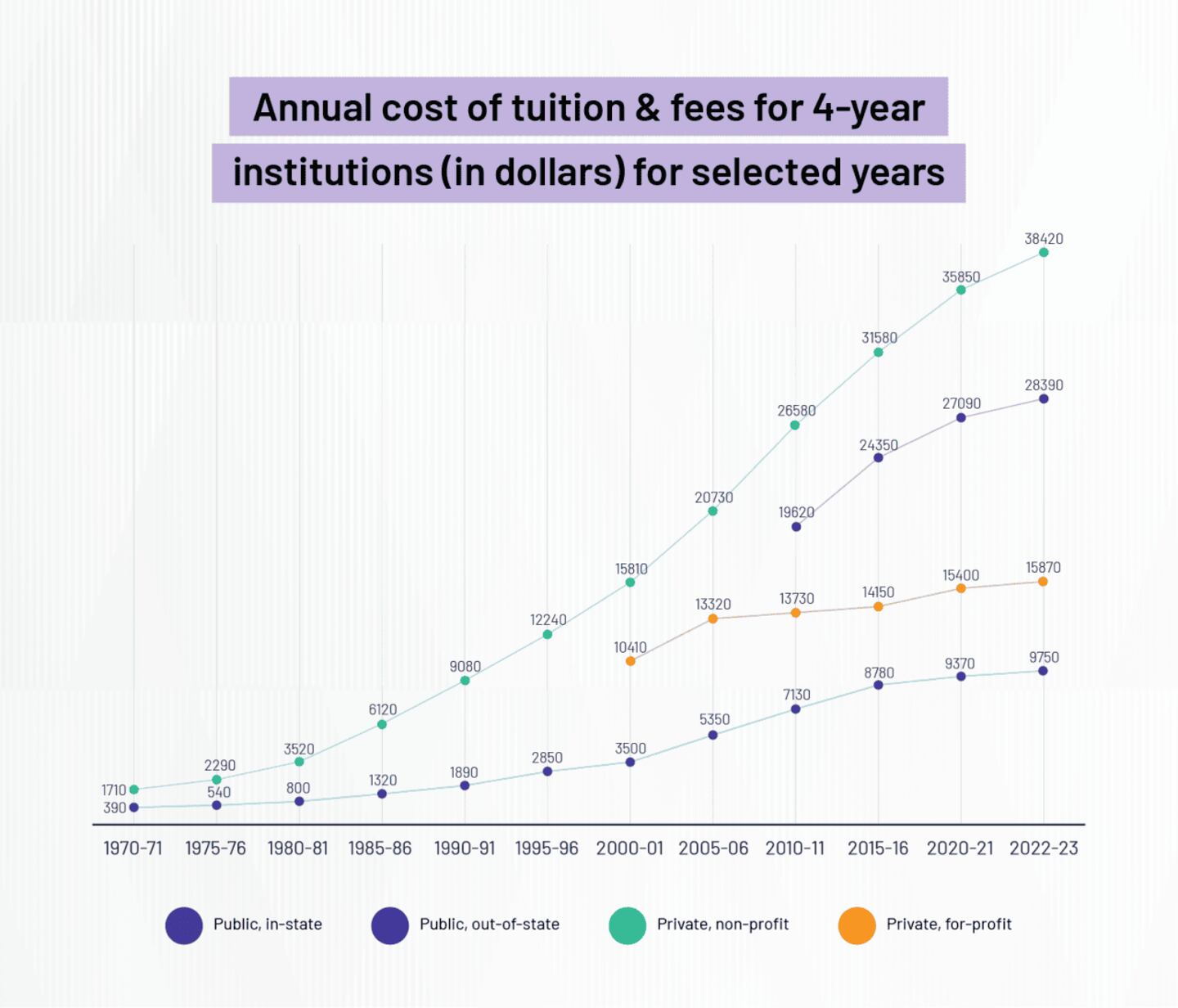 Today's U.S. students can expect to pay an average of $30,884 for tuition, fees, and accommodation over a four-year degree. However, many numbers are above this average. College tuition and fees rose 4.7 percent from 2020 to 2023 alone, and they continue to rise with every passing year, leaving students struggling to keep up.